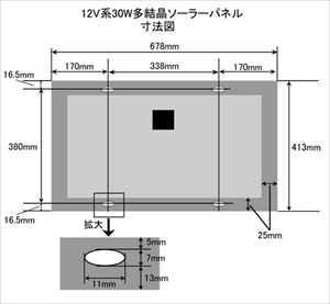 豊富な周辺機器を安価に利用できます。 ○ 発電効率の高い結晶セルの利用により効率のよい面積で高電力を発電。 狭い面積での高出力を可能としています。 ○ 設置するのに程よい寸法で縦横に配置することでお好みの形で増設できます。 このソーラーパネルは、発電部分のセルをガラスで保護しておりフレームとしてはアルミフレームで保護されています。 アルミフレームには取り付けようのビス穴が御座いますので、それらを利用してアングル・ステー・単管パイプなどに固定します。