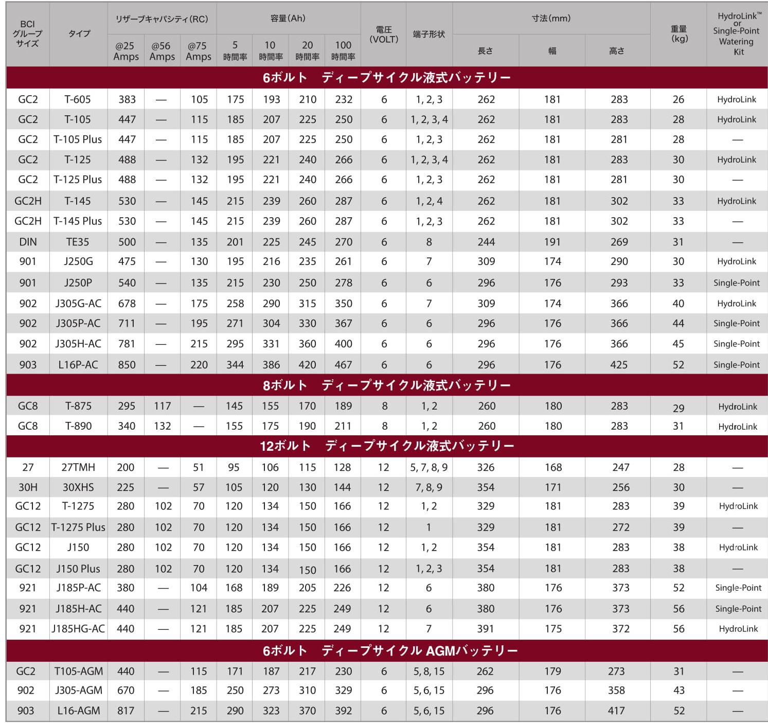 | 用途 | 20時間率 | 5時間率 | 25A放電 | (kg) | 長さ | 幅 | 総高さ | UT | HX | LPT | AP | DL | シングル | プラス | マスター | POD | |