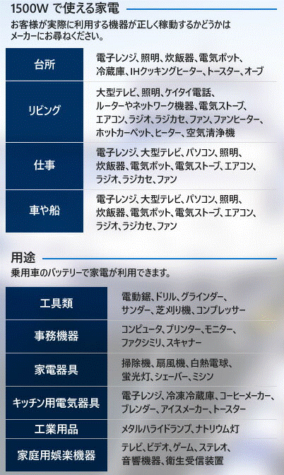ご家庭のコンセントは一般的に、1500W = 15A 100V が多いです。DCACインバーターを選択する際に、1500W 対応を選びますと同じ出力を得られます。つまり、同じ電気製品が使えます。