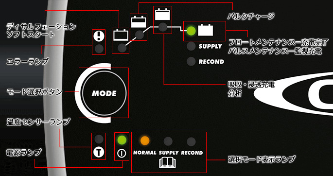 ・RECOND(リコンド)モードにより、過放電したバッテリー(WETバッテリーのみ)のコンディションを整えます。