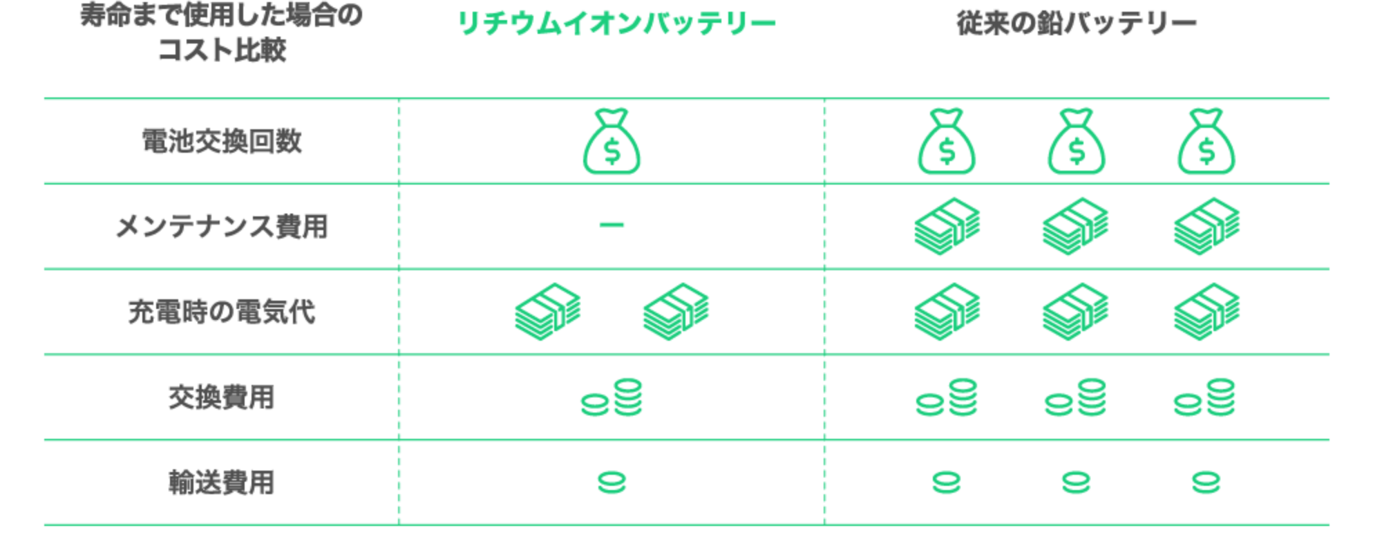 鉛バッテリーと比較してエネルギー密度の高いリチウムイオンバッテリーは、少ない台数で同容量を得ることができます。