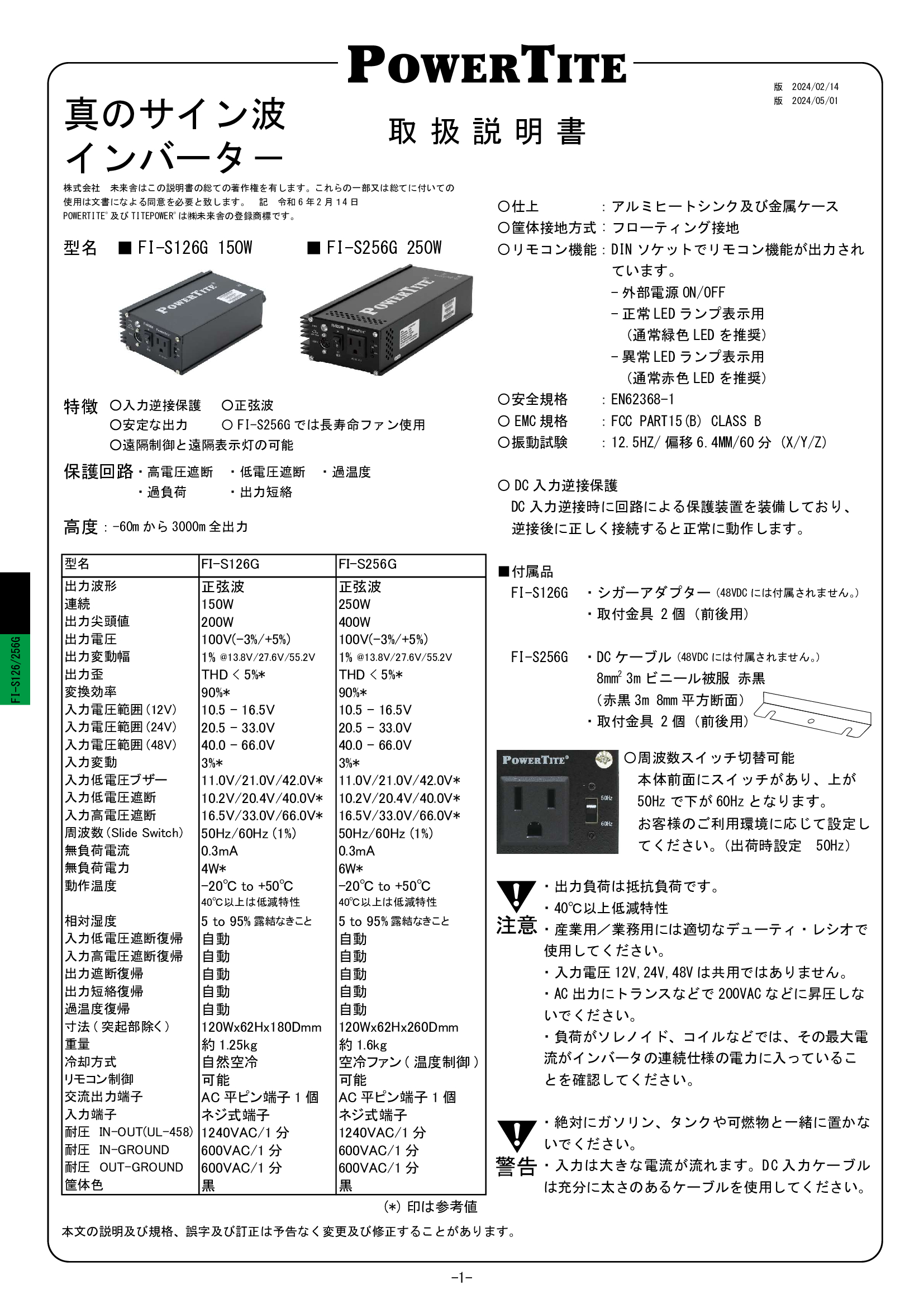 DC->ACインバータ 正弦波 Power Tite 未来舎 FI-S126G-24VDC(旧 FI-S126FR-24VDC) 150W