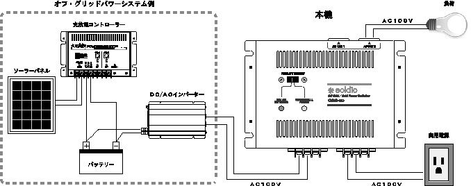 また、本機は上記と逆の動作モードにも設定でき、普段は系統電源を使用し停電時に独立型電源システムに切替える使用方法も実現可能です。