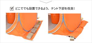 レスキューテントはテント下部を延長することによって転倒防止の重りを置くことが可能です。