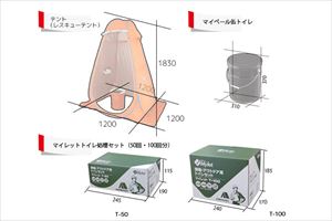 仮設トイレの設置には時間がかかりますが、マイレットのトイレ処理セットとテントがあれば、必要な時にサッと簡易トイレが設置できます。