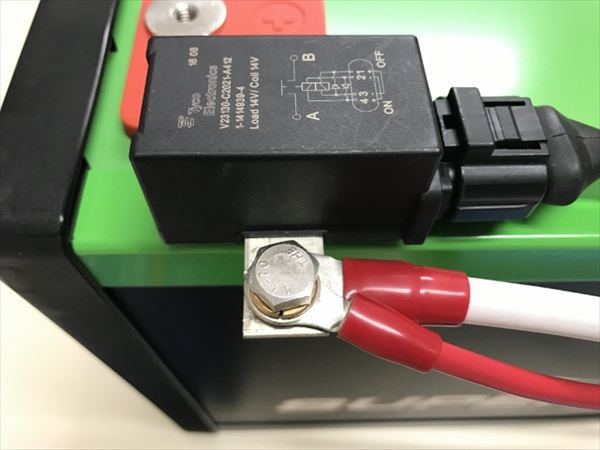 リチウムイオンバッテリーを安全かつ快適にお使いいただくため、バッテリー端子へのラッチリレー取付およびヒューズ取付を行ってください。各部品はセット品に含まれております。