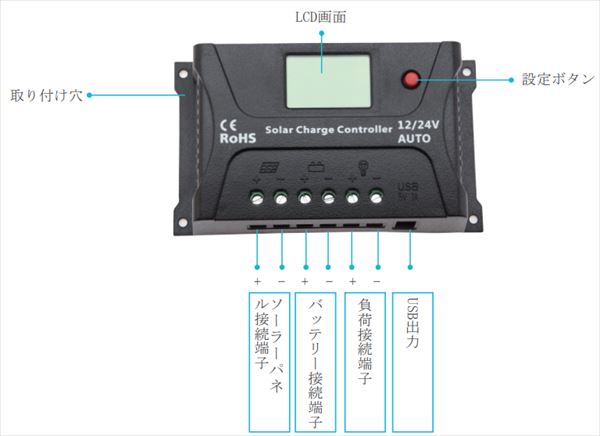 【販売終了】充放電コントローラー LCD表示 10A 12V・24V USB付 / HQST-CTRL-PWM10-LCD
